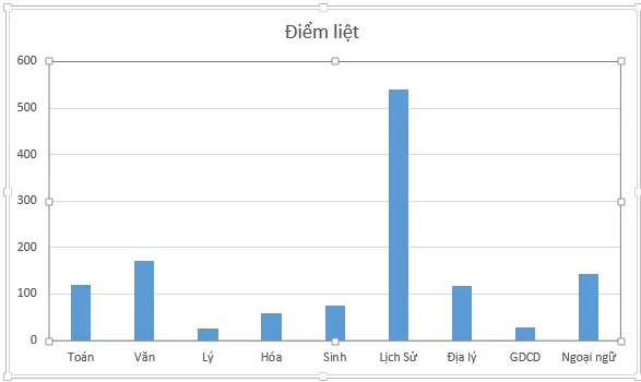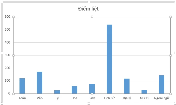 Lịch sử là môn bị điểm liệt nhiều nhất với 540 bài thi. Xếp thứ hai là môn văn với 172 bài thi. Tiếp đến môn tiếng Anh với 144 bài thi. Môn toán xếp thứ tư với 119 bài thi, sau đó môn địa với 118 bài.