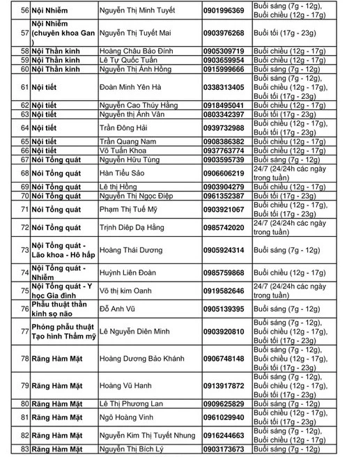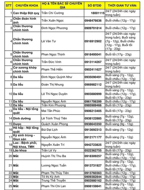 Sau đây là danh sách các bác sĩ hỗ trợ tư vấn qua điện thoại cho người dân: