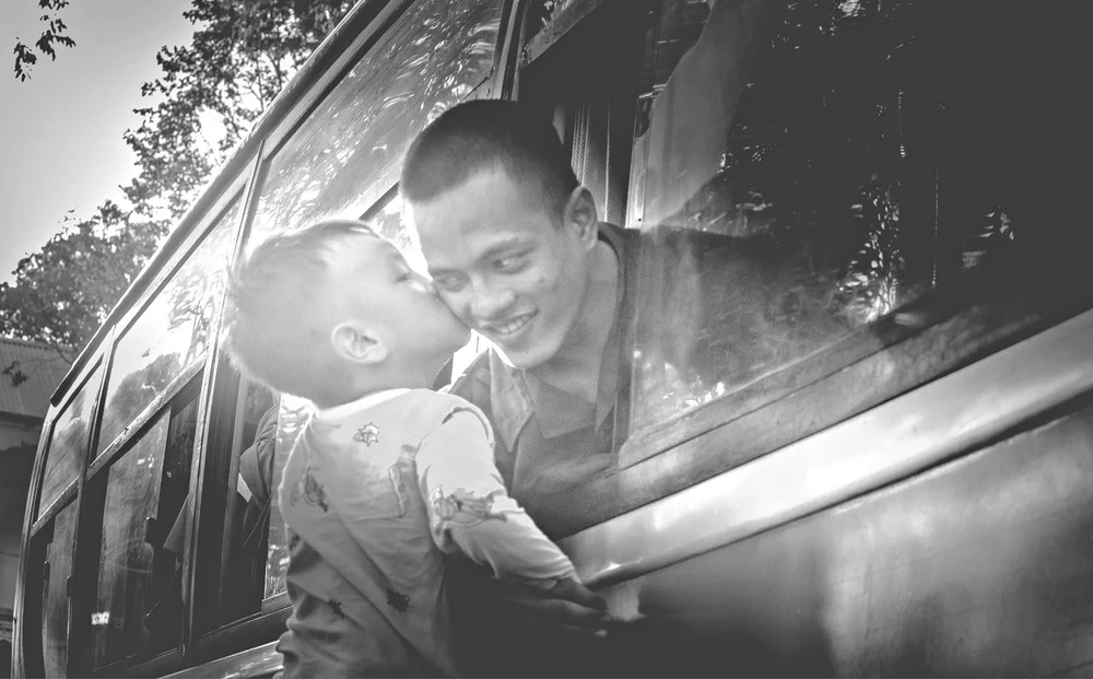 Một tân binh ở quận Ô Môn tranh thủ xe chưa di chuyển hôn con trai .