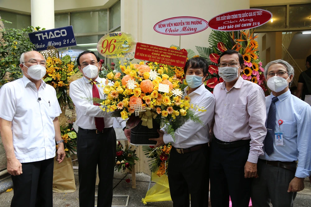 Cũng trong sáng nay, Bí thư Thành ủy TP.HCM Nguyễn Văn Nên đã đến thăm các nhà báo đang được tiêm vaccine tại Hội nhà báo và tặng hoa chúc mừng các nhà báo nhân dịp 21-6.