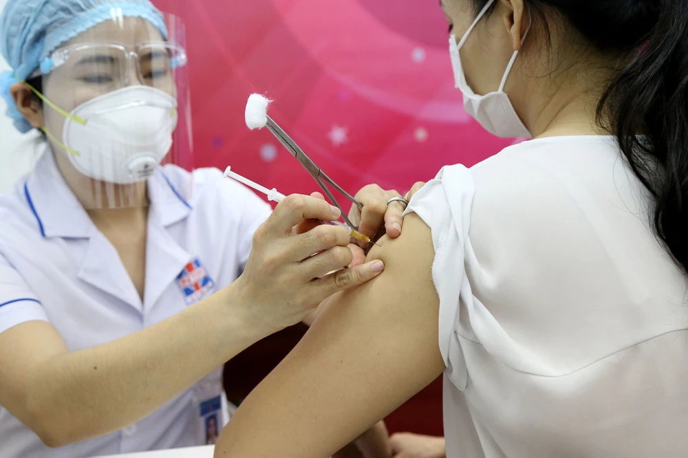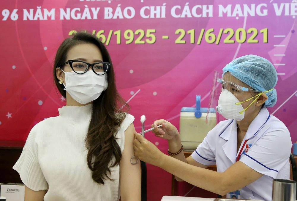 Nhà báo Yến Châu của báo Pháp Luật TP.HCM được tiêm mũi vaccine đầu tiên phòng COVID-19.