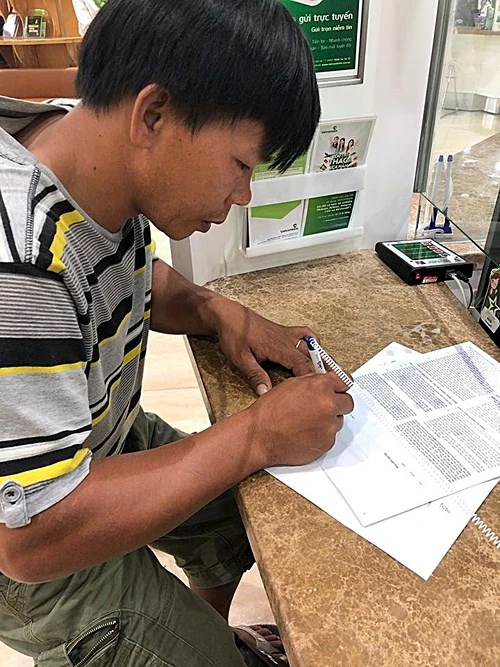 Anh Nguyễn Văn Huy (cha cháu bé) làm thủ tục nhận tiền và chuyển vào tài khoản. Ảnh: PHƯƠNG NAM