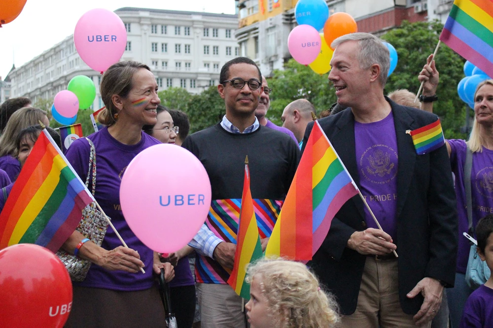 Đại sứ Mỹ tại Việt Nam Ted Osius và người bạn đời Clayton Bond, Tổng lãnh sự Mỹ tại TP.HCM Mary Tarnowka (thứ tư từ phải sang) tham gia chương trình cùng cộng đồng LGBT TP.HCM.