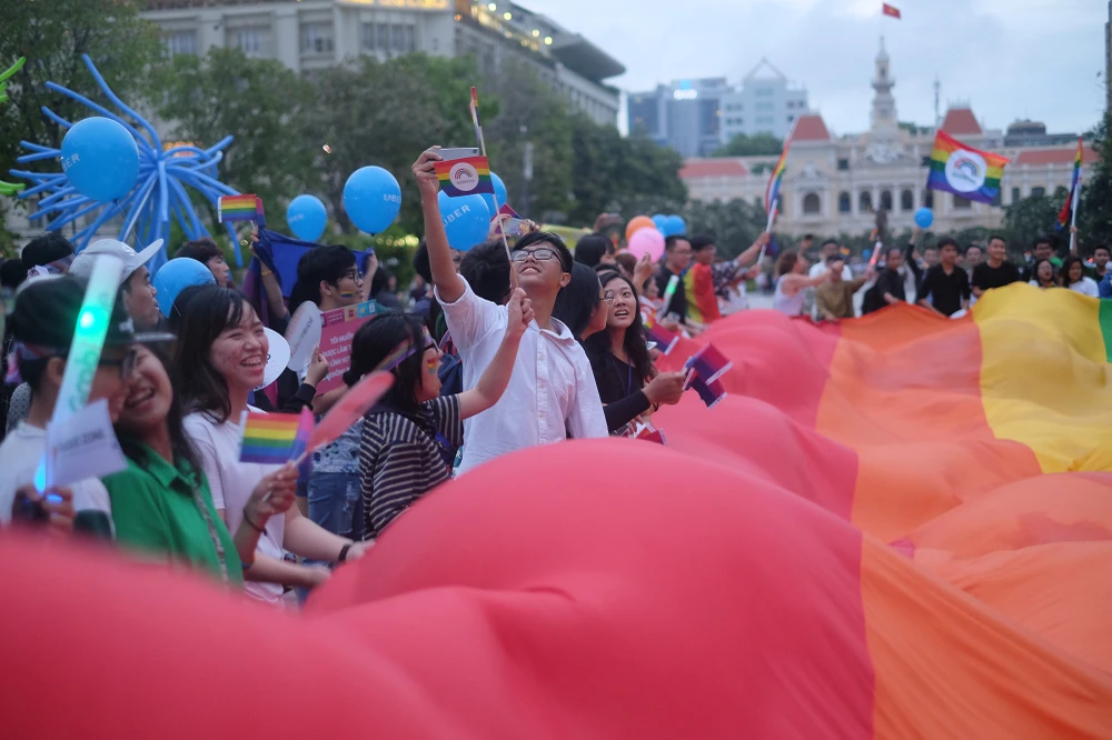 Mặc dù trời đổ mưa nhưng các bạn trẻ đã đến từ rất sớm để tham gia chương trình. Trước sự trầm trồ của hàng ngàn người dân có mặt tại phố đi bộ, tấm cờ lục sắc khổng lồ - biểu trưng của cộng đồng LGBT đã được tung bay thể hiện niềm tự hào của cộng đồng LGBT ở TP.HCM.