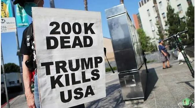 Một người biểu tình ở TP Los Angeles mang biểu ngữ, đổ lỗi cho Tổng thống Trump về việc 200.000 người tử vong vì COVID-19. Ảnh: AFP/CNA