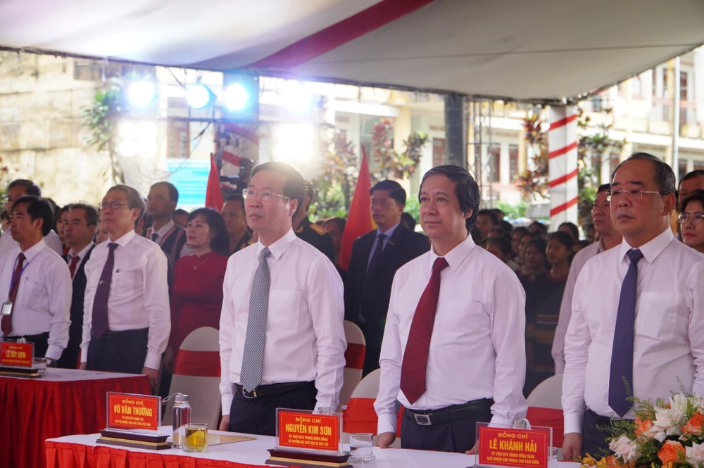 Chủ tịch nước Võ Văn Thưởng và Bộ trưởng Bộ GD-ĐT Nguyễn Kim Sơn dự lễ khai giảng năm học mới tại Trường PT Dân tộc nội trú tỉnh Gia Lai. Ảnh: Lê Kiến