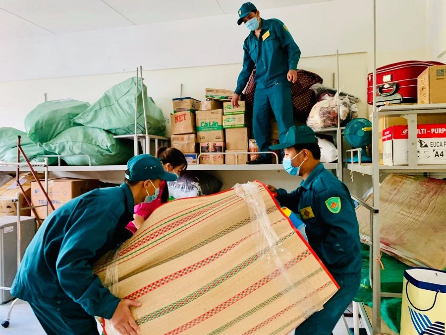 Các tình nguyện viên đang thu dọn đồ đạc tại Ký túc xá ĐH Quốc gia TP.HCM để tiếp tục bàn giao phòng làm khu cách ly. Ảnh:TTQLKTX