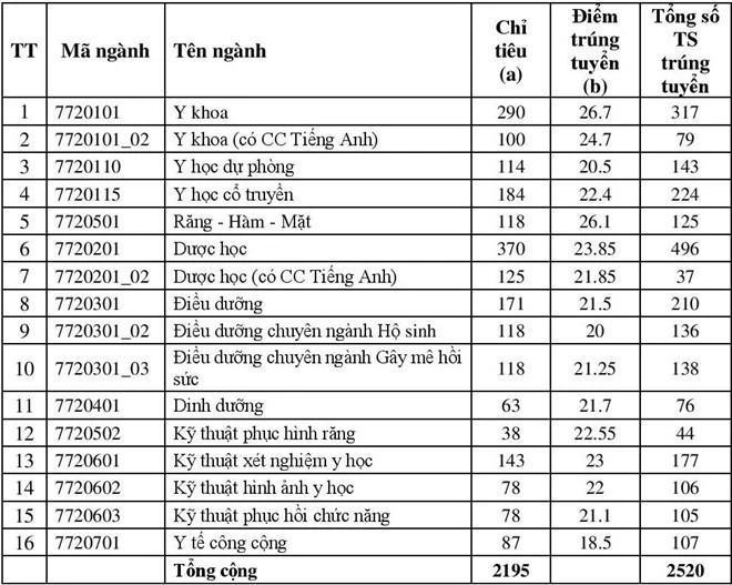 Trong đó, ngành y khoa lấy điểm chuẩn cao nhất với 26,7 điểm, kế đến là y khoa (có chứng chỉ tiếng Anh) và dược học. Mức điểm đầu vào thấp nhất thuộc về ngành y tế công cộng với 18,5 điểm.