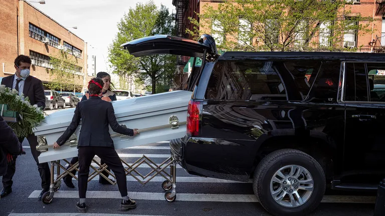 Người dân Mỹ đeo khẩu trang di chuyển một quan tài vào xe tang. Ảnh: RT