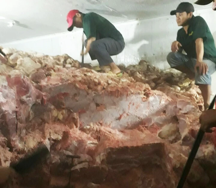 Thịt đông cứng nên phải dùng thanh sắt nạy từng cục. Ảnh: CTV