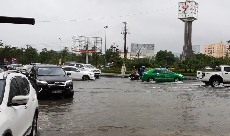 Đường đến cổng Trường THPT Hà Huy Tập (TP Vinh) bị ngập sâu.