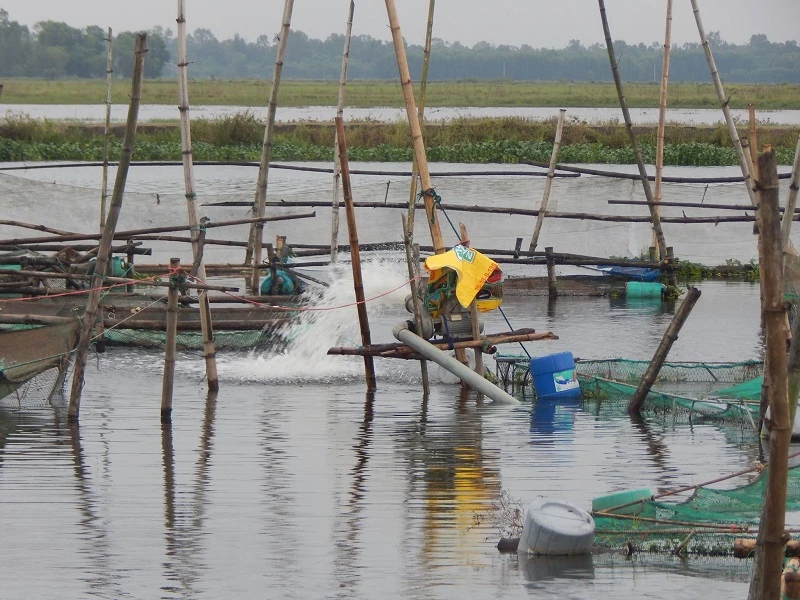 Người dân sử dụng máy bơm nhằm tạo ôxy để hạn chế tình trạng cá chết.