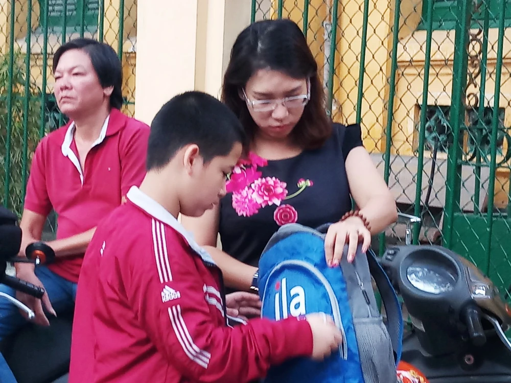 Mẹ kiểm tra đồ dùng cho con trước khi vào điểm thi.