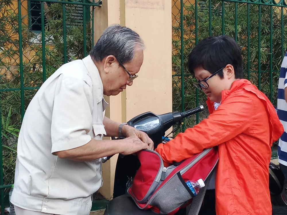 Hai ông cháu cùng kiểm tra đồ dùng trước khi vào trường.