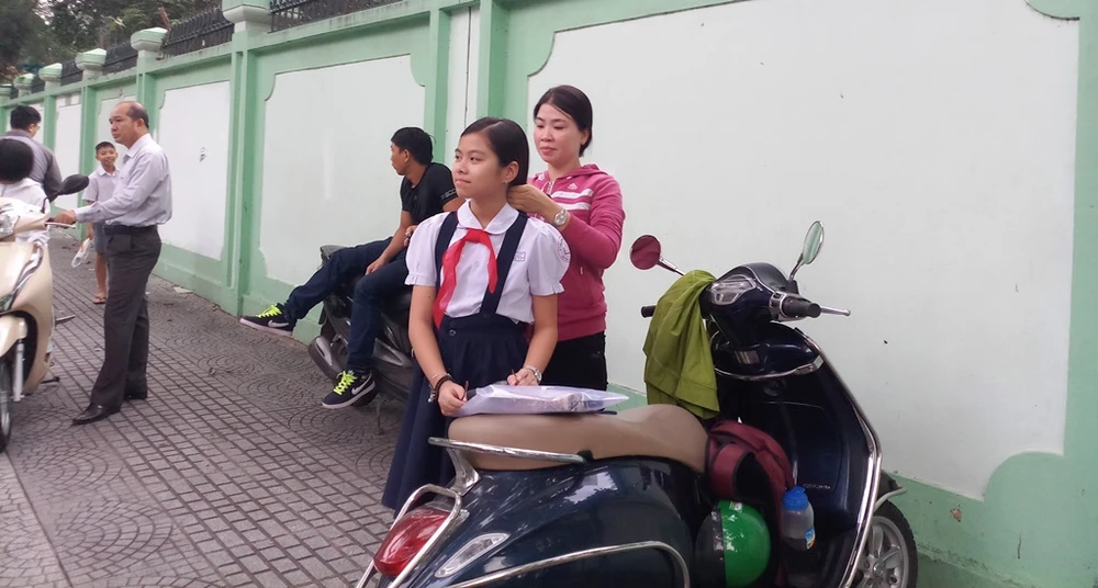 Mẹ chải tóc cho con trước khi con bước vào phòng thi.