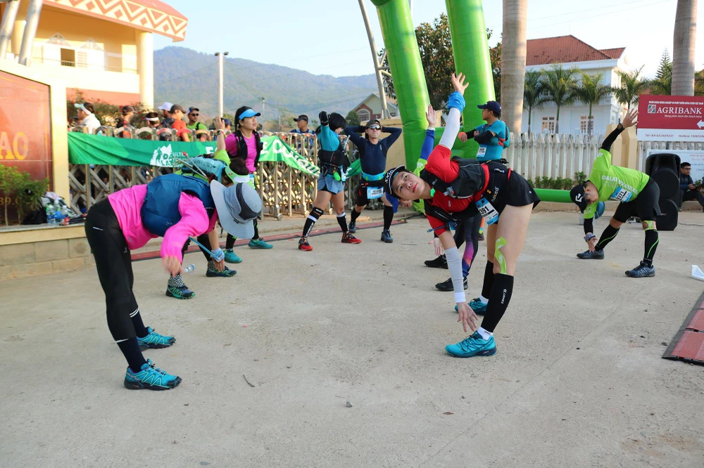 Các VĐV khởi động trước khi tham gia đường chạy.