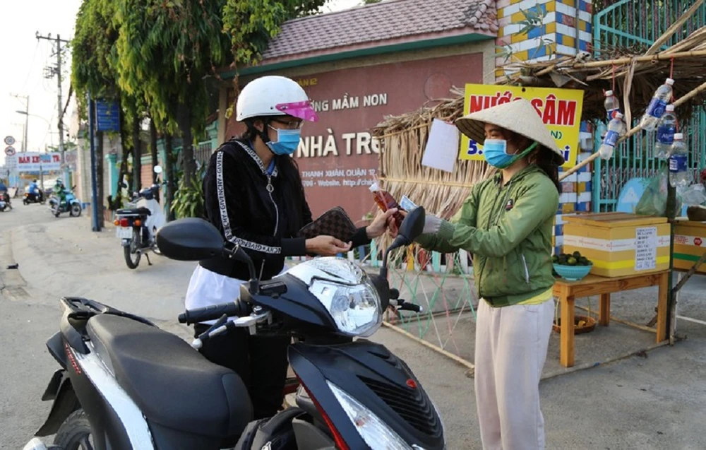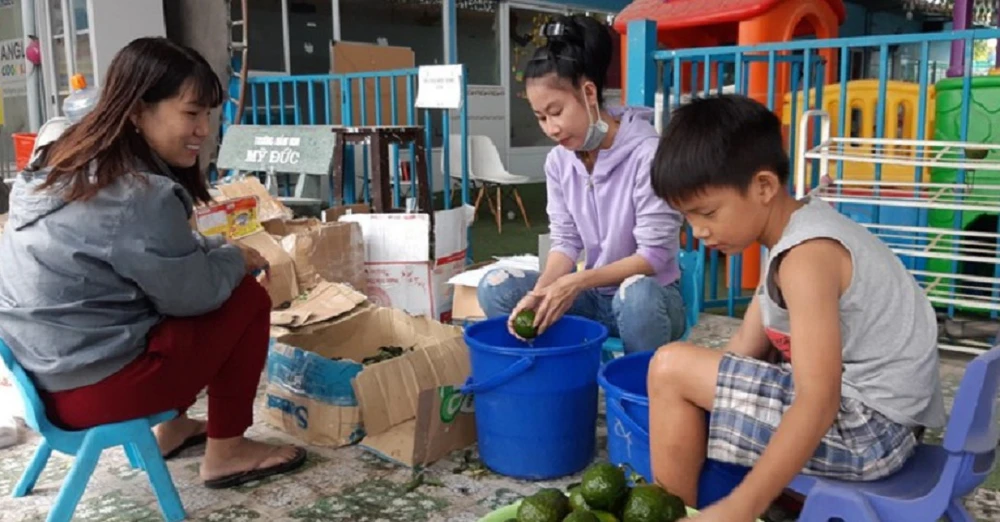 Các cô giáo Trường Mầm non Ngôi nhà trẻ thơ (quận 12, TP.HCM) bán hàng kiếm thêm thu nhập trong thời gian trẻ nghỉ học . Ảnh: HOÀNG GIANG