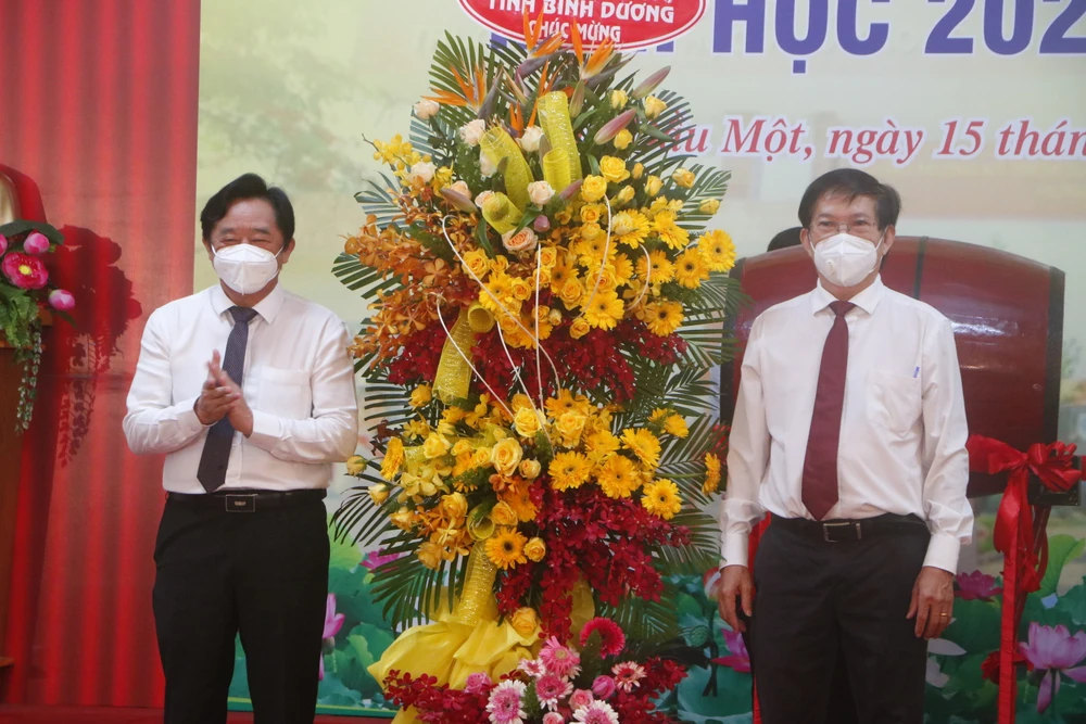 Ông Nguyễn Hoàng Thao (trái), Phó Bí thư thường trực tỉnh ủy Bình Dương tặng hoa chúc mừng Trường THPT chuyên Hùng Vương. Ảnh: LÊ ÁNH