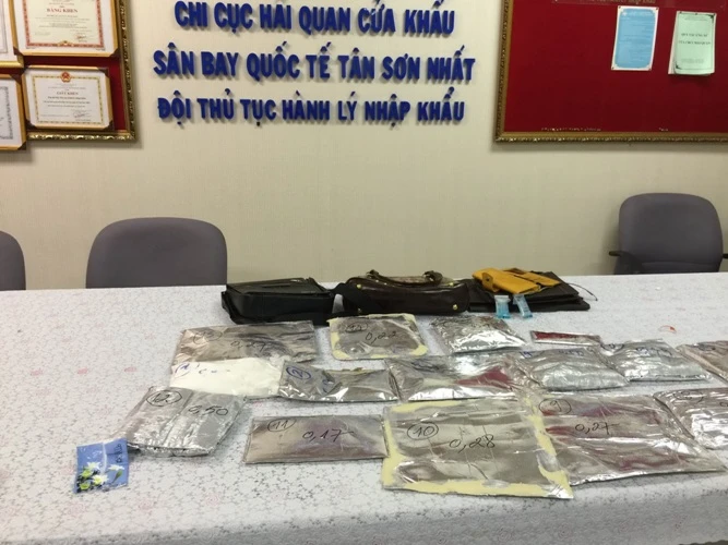 Khi đối tượng mang hành lý ký gửi qua máy soi, lực lượng hải quan đã phát hiện những hình ảnh nghi vấn nên lập tức yêu cầu nữ hành khách này mang valy và túi xách đi kiểm tra. Qua kiểm tra hải quan đã dùng dao rạch các lớp vải lót bên trong túi xách tay, trong thành bìa sổ, bên trong lớp chỉ cuộn màu đen, bên trong các cuộn giấy màu trắng... và phát hiện có tổng cộng 16 gói chất bột trắng được ngụy trang.