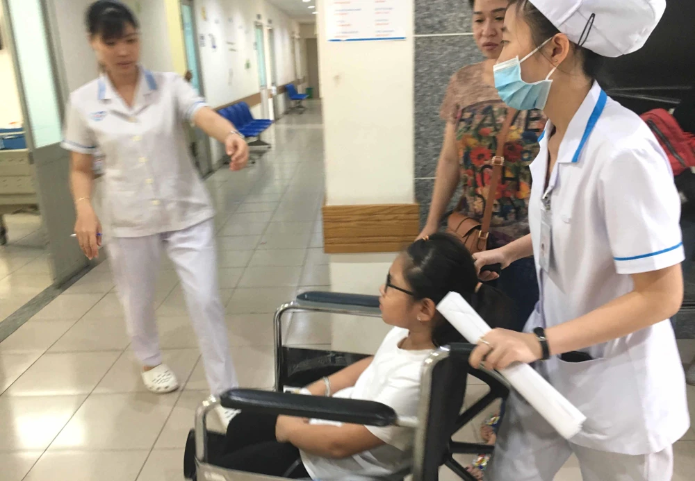 Một học sinh được mẹ đưa tới BV vào sáng 6-4. Ảnh: HOÀNG LAN