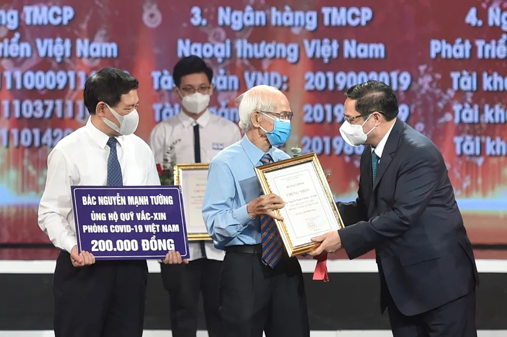 Sau khi phát biểu, Thủ tướng Chính phủ Phạm Minh Chính đã chứng kiến đại diện các tầng lớp nhân dân đóng góp vào Quỹ vaccine phòng chống COVID-19.