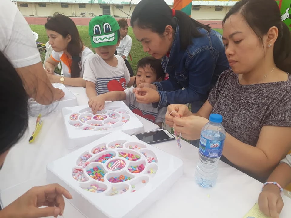 Các bà mẹ và bé gái đều thích thú trò chơi làm vòng đeo tay thủ công.