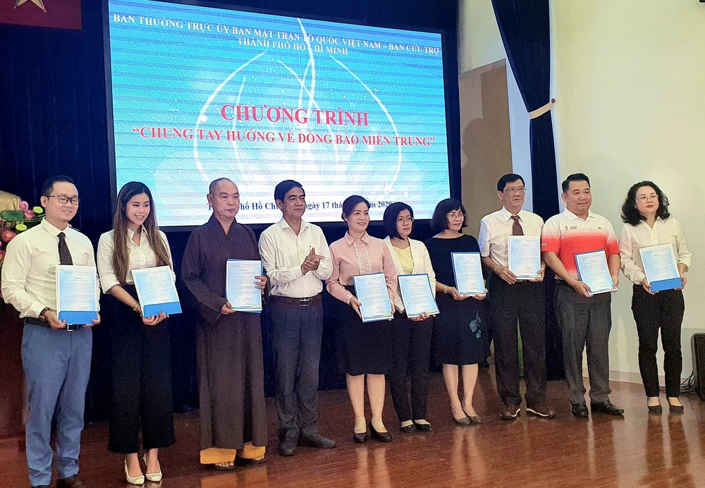 Đại diện các đơn vị hỗ trợ đồng bào miền Trung thông qua UBMTTQ Việt Nam TP.HCM. Ảnh: ĐẶNG LÊ