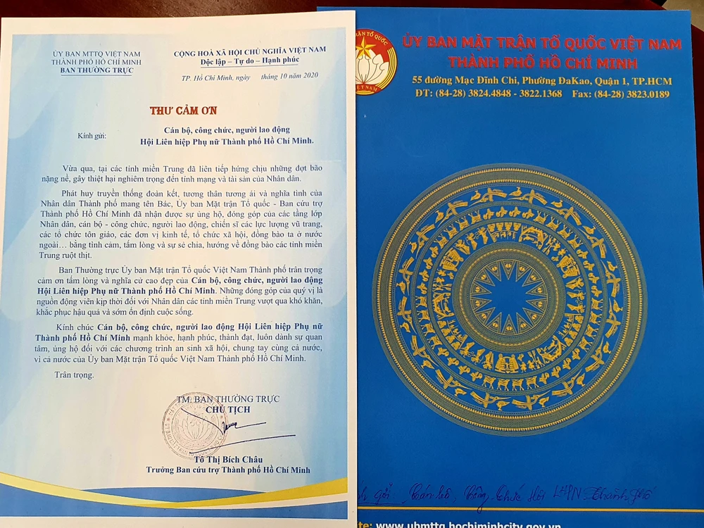 Thư cảm ơn của UBMTTQ Việt Nam TP.HCM gửi các đơn vị hỗ trợ. Ảnh: ĐẶNG LÊ