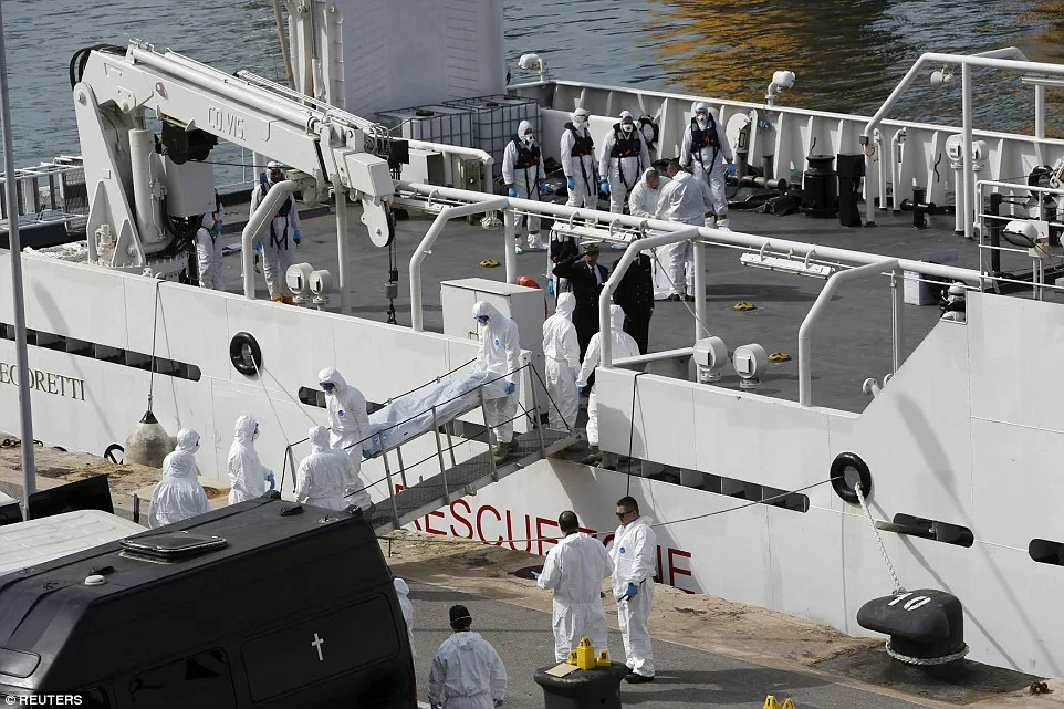 Các nhân viên cứu hộ chuyển xác nạn nhân ra khỏi tàu tuần tra bờ biển của Ý(Ảnh: Reuters)