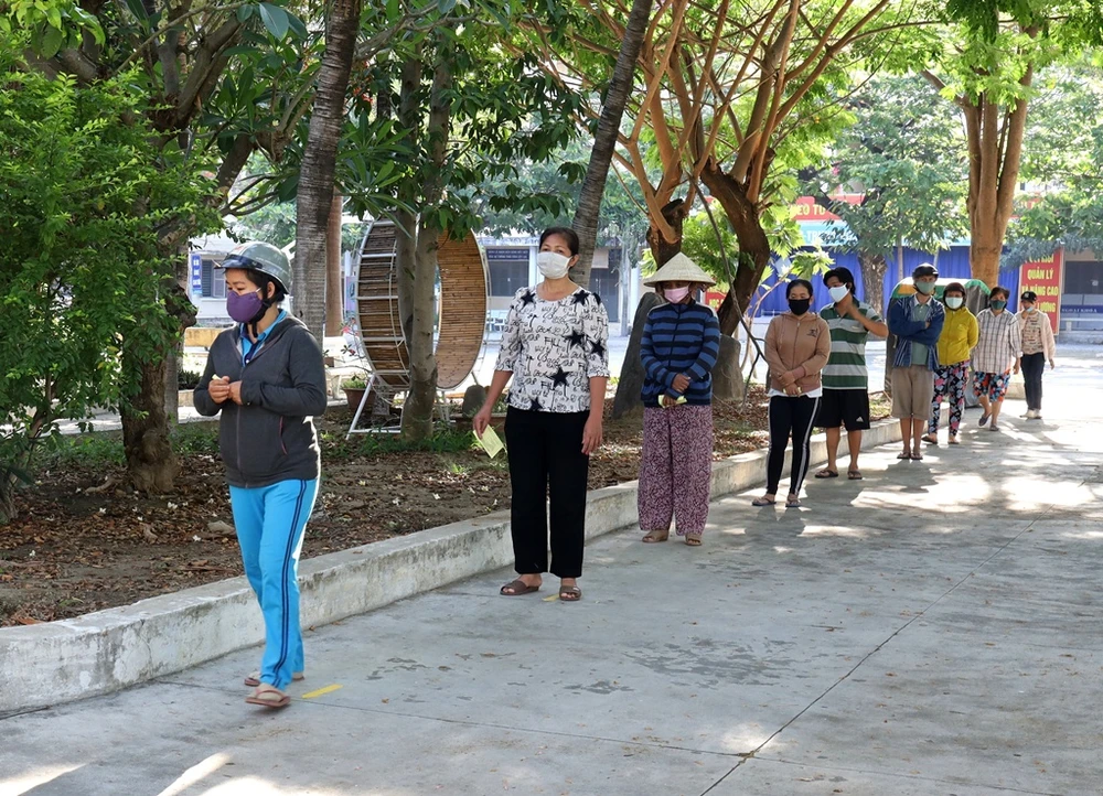 Người dân xếp hàng nghiêm túc vào nhận quà