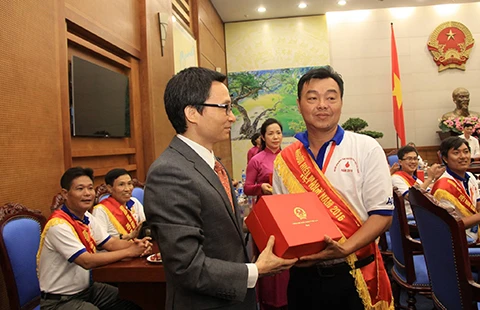 Phó Thủ tướng Chính phủ Vũ Đức Đam động viên tinh thần anh Thuận trong lễ “Tôn vinh 100 người hiến máu tiêu biểu Việt Nam năm 2016” diễn ra vào ngày 14-6. Ảnh: NVCC