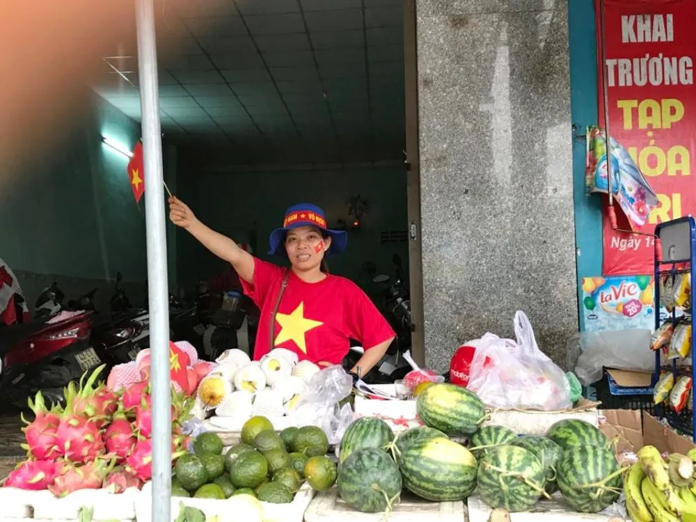 Các tiểu thương đều khoác trên mình áo cờ đỏ sao vàng và băng rôn để cổ vũ cho đội tuyển U-23 Việt Nam.