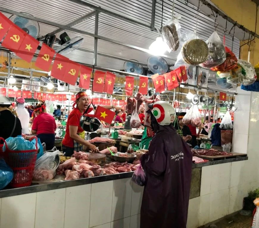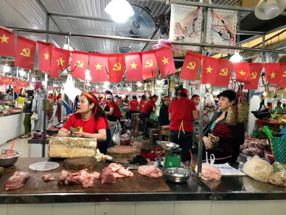 Cờ đỏ sao vàng được treo khắp các gian hàng trong chợ Hòa Hải.