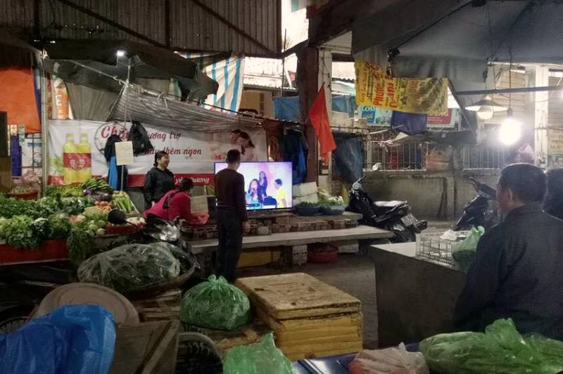 Hôm nay cuối tuần, nhiều người được nghỉ, cũng có những người phải mưu sinh kiếm sống nhưng dù ở nơi đâu thì mọi người dân Việt Nam đều dõi theo trận đấu lịch sử của U-23 Việt Nam. Vì vậy, tại các ngả đường, khu chợ, nhà hàng hôm nay đều nhuộm cờ đỏ sao vàng.
