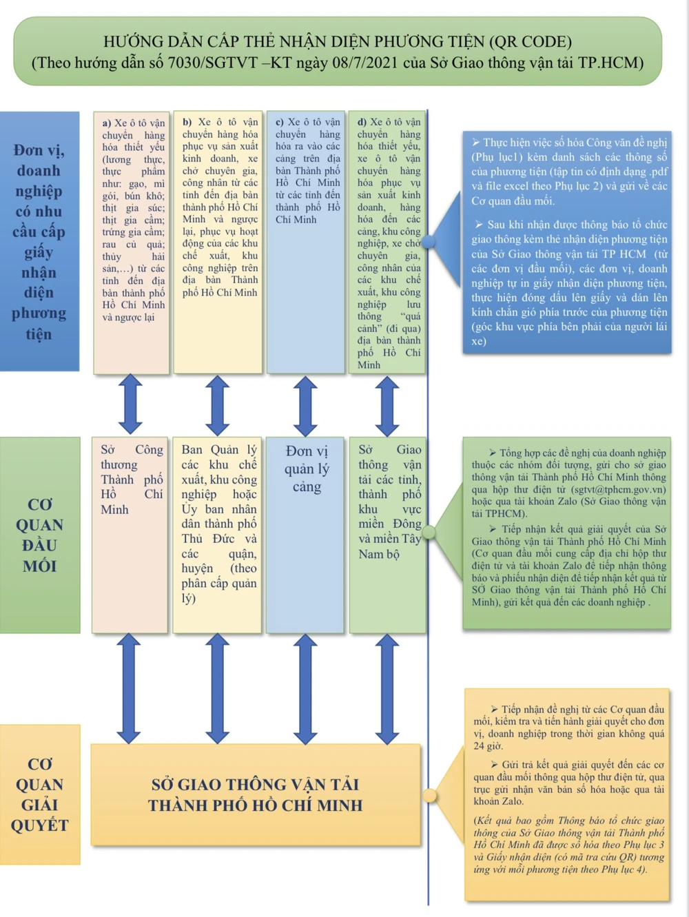 Để thuận tiện trong quá trình triển khai thực hiện, Sở GTVT gửi sơ đồ hướng dẫn cụ thể công tác cấp Giấy nhận diện phương tiện (QR Code) cho các xe ô tô vận chuyển hàng hóa, vận chuyển công nhân, chuyên gia và các tổ chức, cá nhân khác có liên quan từ TP.HCM đi các tỉnh, từ các tỉnh đến TP.HCM và phương tiện đi qua địa bàn TP.HCM.