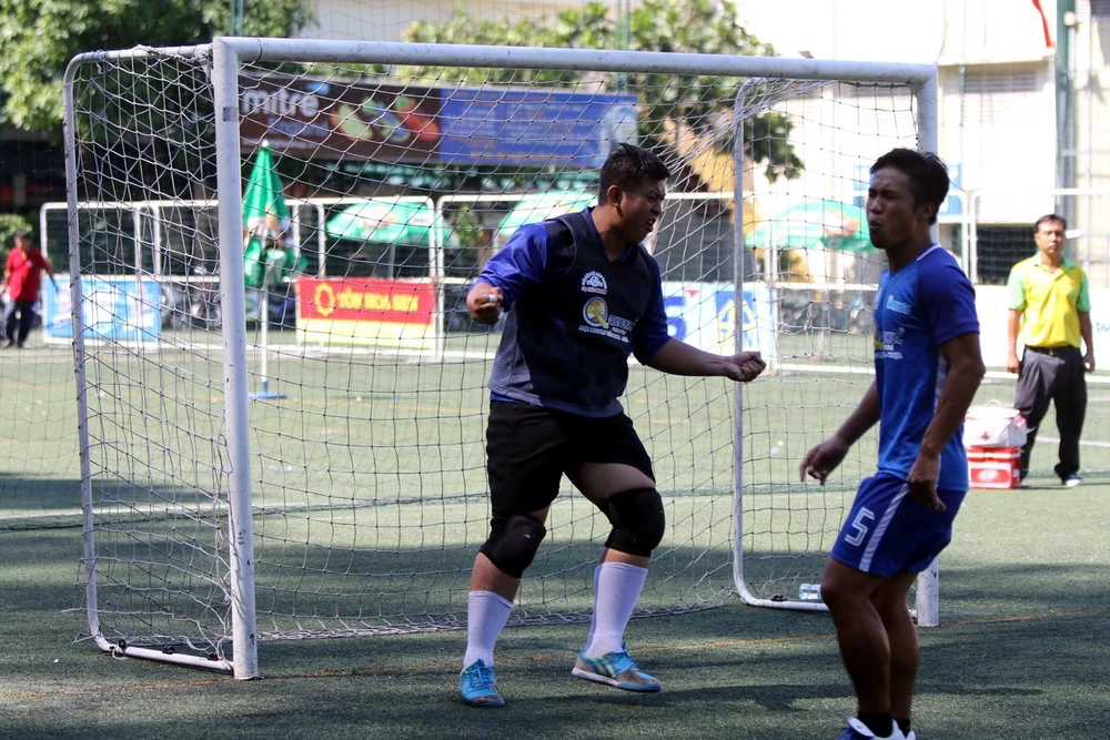 Đào Dũng (Liên quân CLB Phóng viên Thể thao) truy cản bóng đối phương
