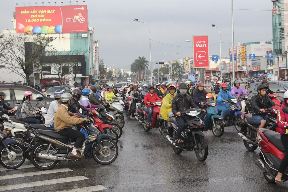Người dân từ các vùng ven đổ về trung tâm TP Đà Nẵng để làm việc qua nút giao thông Nguyễn Tri Phương-Điện Biên Phủ ùn ứ. NGUYỄN TRI.