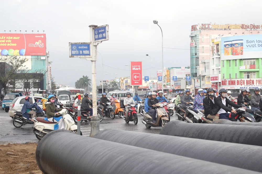 Ngay sau khi phân luồng, cấm đường tại một số đoạn để thi công hầm chui nút giao thông cửa ngõ phía Bắc vào trung tâm tại Nguyễn Tri Phương-Điện Biên Phủ.