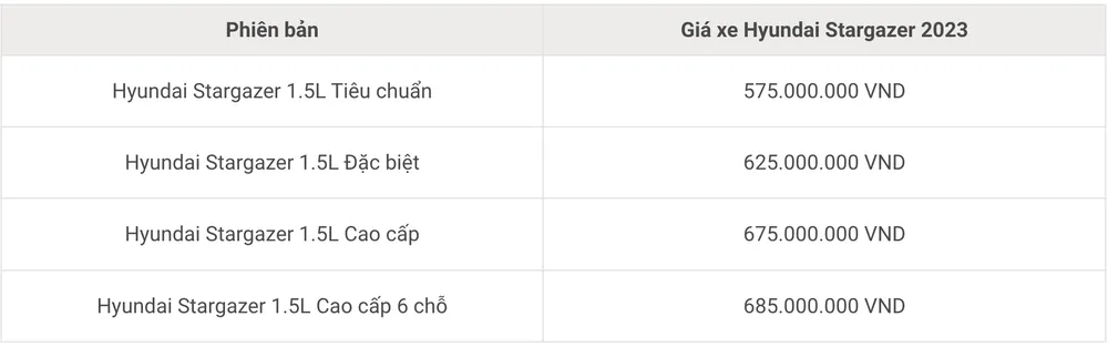 Stargazer trang bị động cơ xăng 1,5 lít Smartstream G 1.5L mới, công suất 115 mã lực tại 6.300 vòng/phút, mô-men xoắn cực đại 144 Nm tại 4.500 vòng/phút. Trong đợt bán ra tại Việt Nam lần này, xe chỉ có một lựa chọn hộp số iVT (hộp số CVT của Hyundai với dây đai được làm dạng xích). Hệ dẫn động cầu trước. Hộp số sàn 6 cấp không có như thị trường Indonesia.