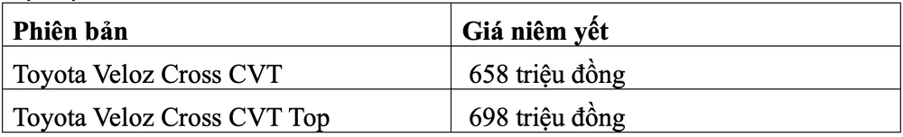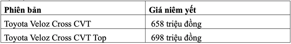 Veloz Cross trang bị khối động cơ 1.5L cho công suất cực đại 105 mã lực tại 6.000 vòng/phút, mô men xoắn cực đại 138Nm tại 4.200 vòng/phút. Tuy chỉ dùng động cơ dung tích khiêm tốn 1.5L nhưng sức mạnh đầu ra vẫn vừa vặn để mẫu xe hoàn thành tốt vai trò của mình.