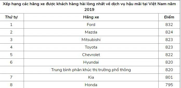 Đặc biệt, Honda xếp ở vị trí thứ tám, vị trí cuối cùng trong danh sách các hãng xe tại Việt Nam. Theo đó, Honda chỉ được đánh giá với số điểm là 795 điểm. Tương tự như Honda, đánh giá dịch vụ của Toyota cũng bị tụt số hạng xuống còn vị trí thứ tư.