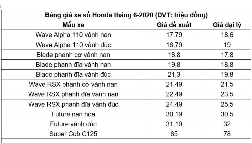 Khác với các dòng xe ô tô, bảng giá xe máy Honda không có nhiều biến động trong tháng 6. Trong đó, một số dòng xe số có sự giảm nhẹ như Wave Alpha, Wave RSX…