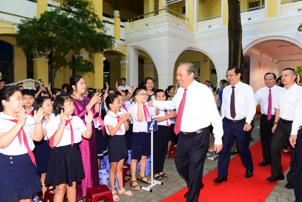 Phó Thủ tướng Thường trực Chính phủ Trương Hòa Bình tham dự lễ khai giảng và trao tặng mũ bảo hiểm cho các em học sinh.