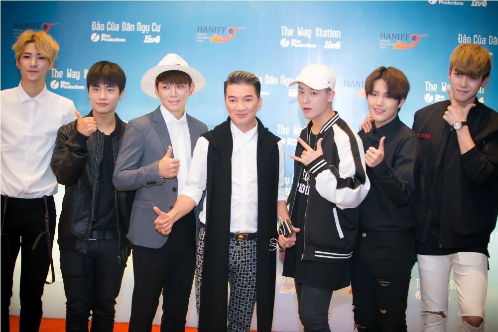 Ca sĩ Đàm Vĩnh Hưng và nhóm nhạc đến từ Hàn Quốc tại buổi giới thiệu phim.