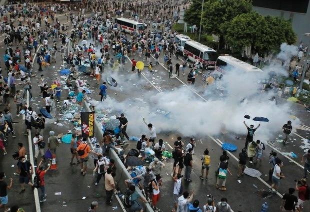 Những người biểu tình đã chuẩn bị thêm dù để tự bảo vệ mình, thậm chí trang bị cả mũ bảo hiểm và mặt nạ phòng độc. Đám đông hàng ngàn người vẫn đang tràn xuống đường phố, gây ra một quang cảnh hết sức hỗn loạn.