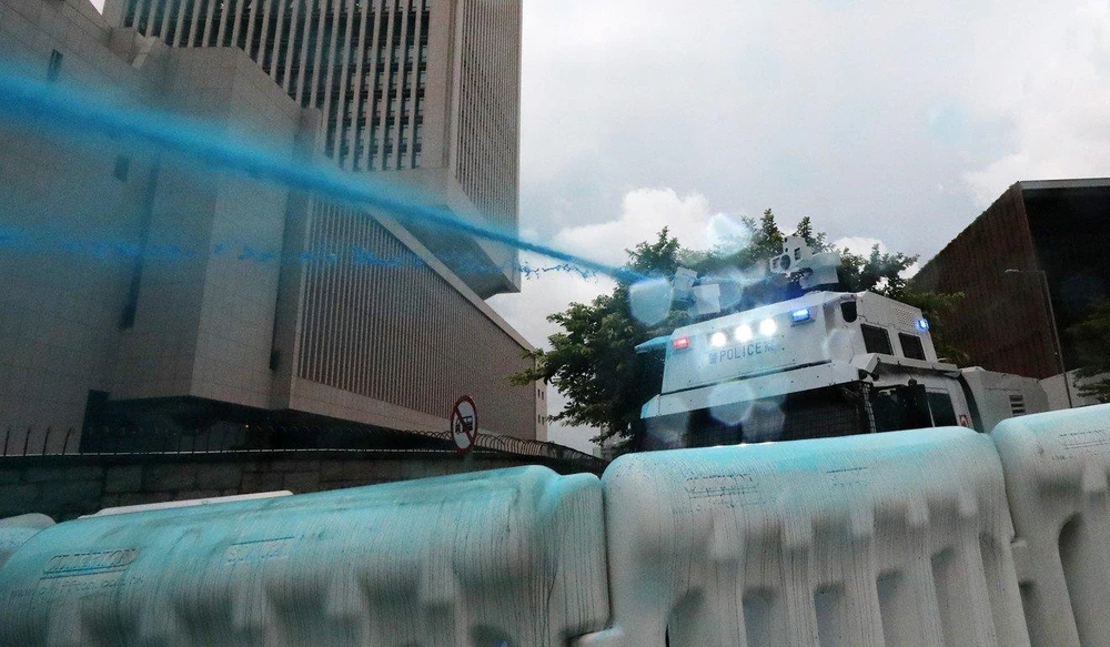 Vòi rồng xịt dung dịch nhuộm vào người biểu tình ở Hong Kong ngày 31-8. Ảnh: SCMP