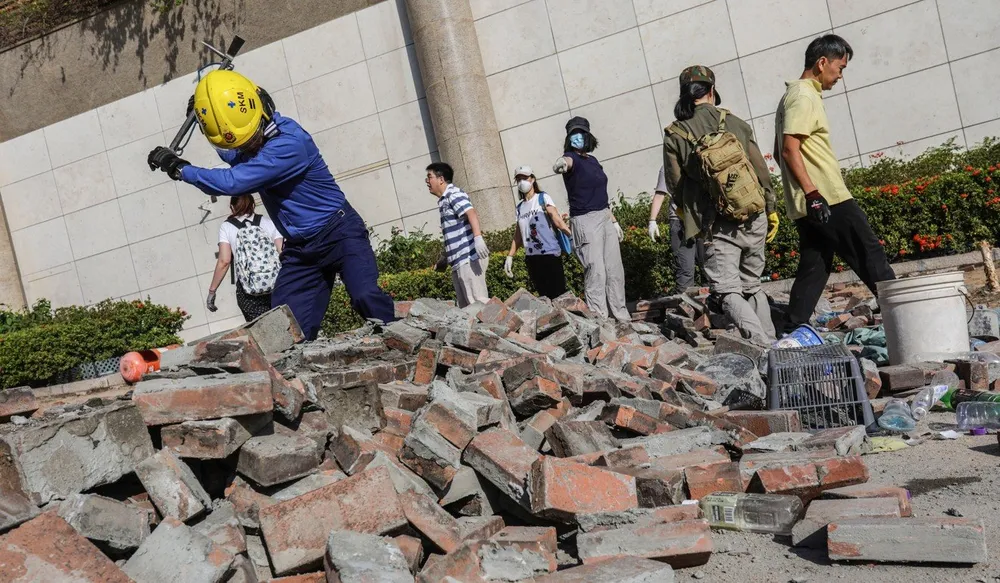 Lính cứu hỏa và người tình nguyện giúp dọn dẹp chướng ngại vật bên ngoài trường đại học Thành phố ở Hong Kong, ngày 17-11. Ảnh: SCMP