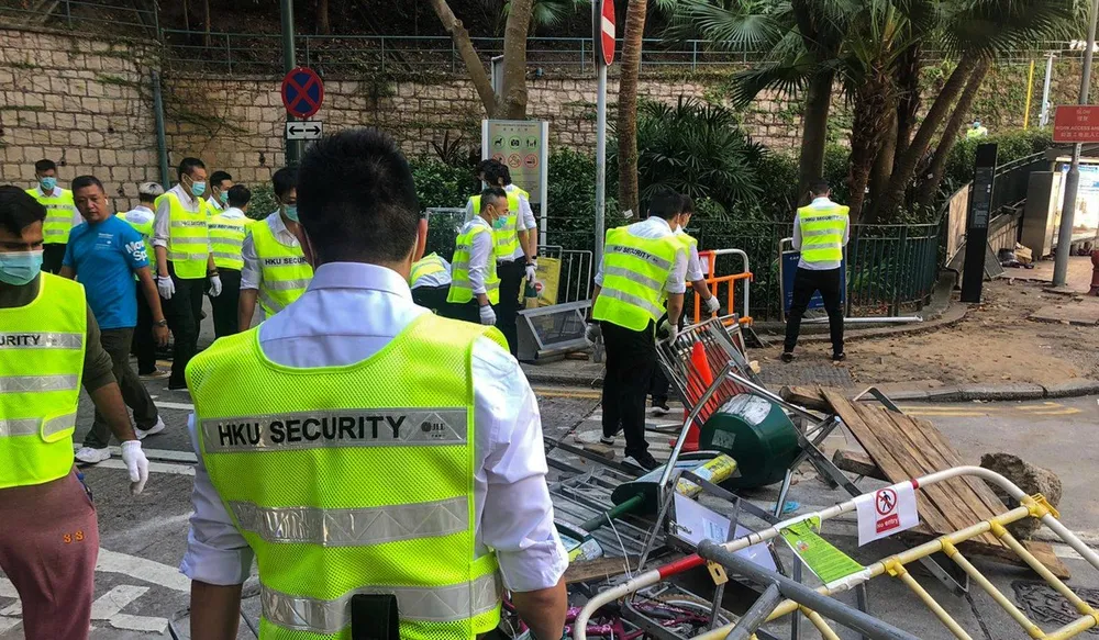Bảo vệ dọn dẹp chướng ngại vật trước cổng trường đại học Hong Kong, ngày 17-11. Ảnh: SCMP