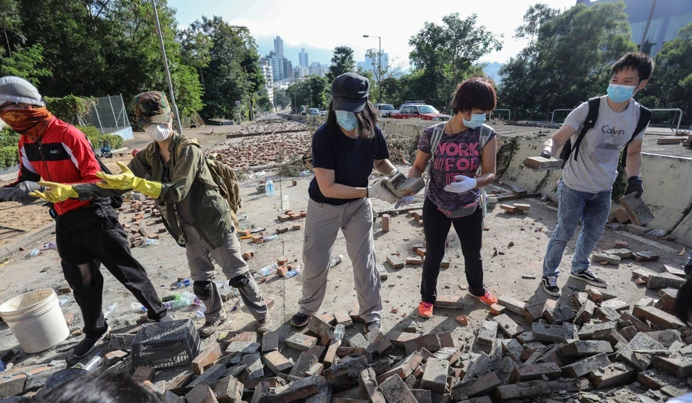 Người tình nguyện giúp dọn dẹp chướng ngại vật bên ngoài trường đại học Thành phố ở Hong Kong, ngày 17-11. Ảnh: SCMP