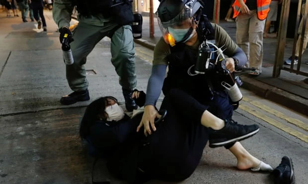 Cảnh sát chống bạo động chặn bắt một người biểu tình ở Hong Kong ngày 9-6 nhằm kỷ niệm một năm làn sóng biểu tình phản đối dự luật dẫn độ. Ảnh: Tyrone Siu/REUTERS